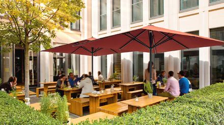 Der Gastroschirm Big Ben ist ideal für Terrassen von Cafés, Biergärten oder Hotel-Restaurants, die ihren Außenbereich ganzjährig bewirtschaften. Windstabil und ausgelegt für Dauerbelastungen ist der Großschirm mit Spannweite bis zu 7 m eine hochwertige und elegante Lösung für die Außengastronomie.