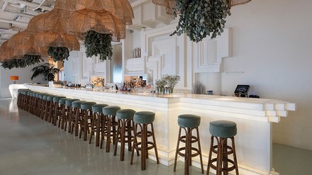 Das tropisch anmutende Innenraum-Design wird in den offen gestalteten und hybrid geplanten Bar/Bistro-Räumlichkeiten aufgegriffen und fortgeführt. Dort können sich Gäste bei Snacks, Drinks und Latin-Funk-Musik leicht in Urlaubsstimmung versetzen lassen. Auch hier, wo bis zu 140 Gäste Platz finden, ist die dominierende Farbe ein elegantes, freundliches Weiß, das nur durch die natürlichen Farbtöne der Rattan-Hängeleuchten und Barhocker sowie den von der Decke hängenden Pflanzen gebrochen wird.