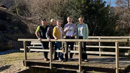 Familie König erhält die Urkunde „Wanderbares Deutschland“ von Vertretern der Region auf einer Holzbrücke in Münsingen-Gundelfingen.