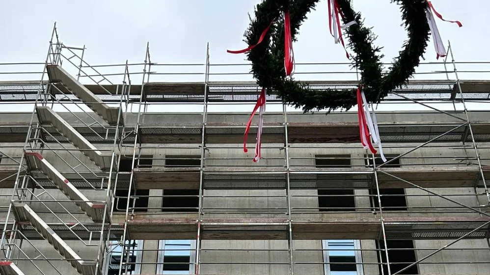 Das Büro PSP aus Hamburg zeichnet für die Architektur verantwortlich. Bei herbstlichen Temperaturen übernahm Matthias Beier vom verantwortlichen Generalbauunternehmen Kassecker unter Applaus der Anwesenden den feierlichen Richtspruch.